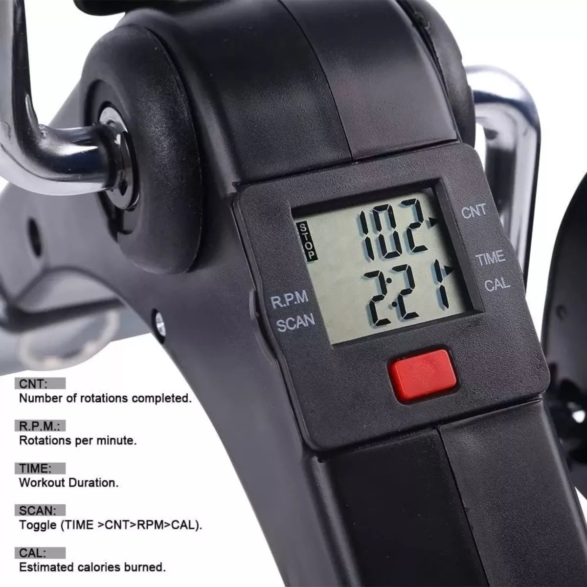 ESPECIFICACIONES Con dimensiones de ancho 38.5 cm, alto 24 cm y largo 53 cmPeso del producto de solo 2,2 kg,Soporta hasta 110 kg y sus correas ajustables se adaptan a diferentes tamaños de piePantalla para monitorear tiempo, distancia, calorias quemadas, y velocidad. ¡Transforma tu rutina hoy mismo con nuestra Mini Bicicleta Estática de Pedales!